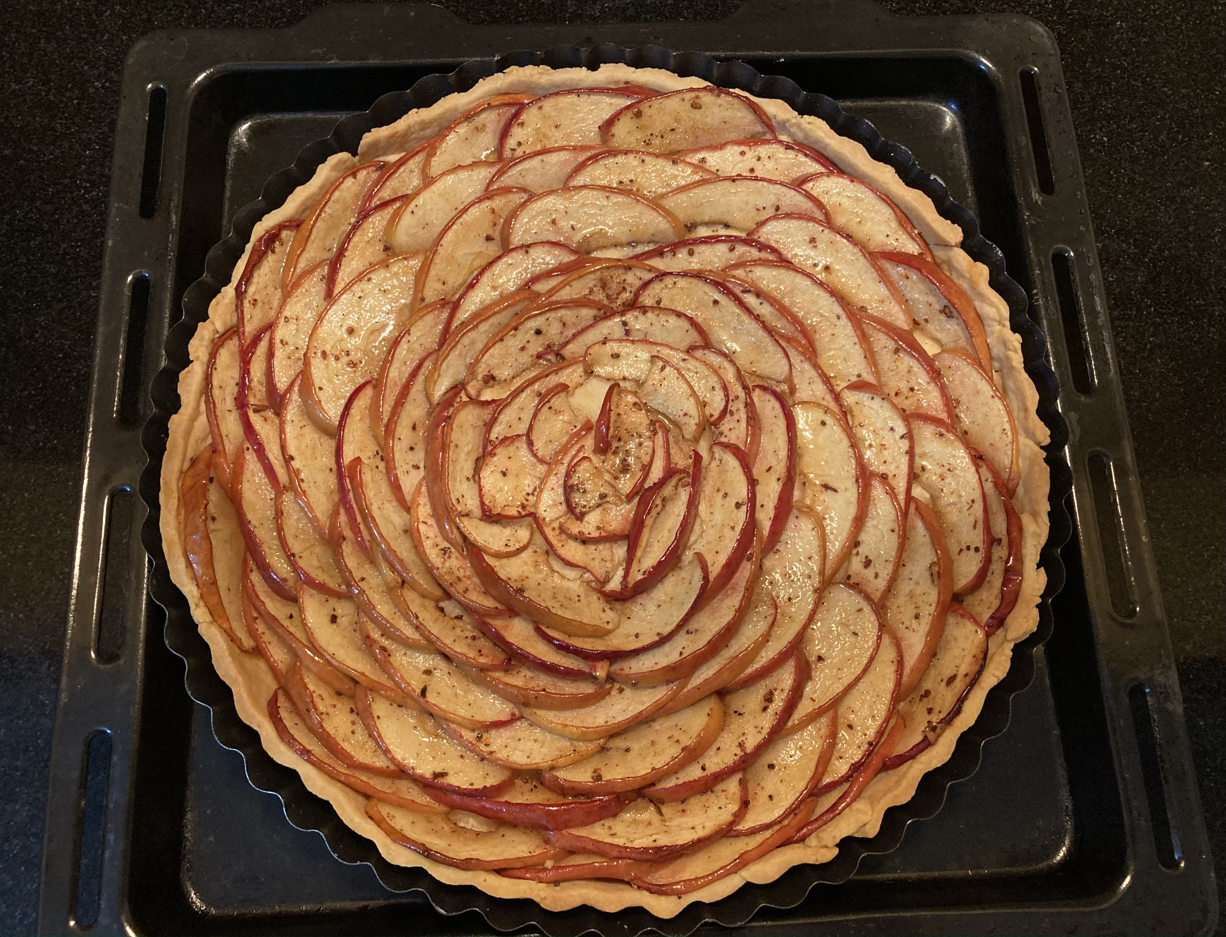 13. Place the tart on a baking sheet and bake for about 1 hour – the apples should have softened and the tart base should be golden.