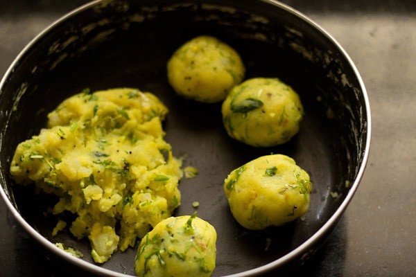 Boil the potatoes and mash. Add salt, chopped garlic and grated ginger and green chillies, Mix well. Take oil in a pan. Add mustard seeds, urad dal and chana dal . Add the potato mixture. Fry for a few minutes. Add chopped coriander leaves. When cool add lemon juice and make round balls.