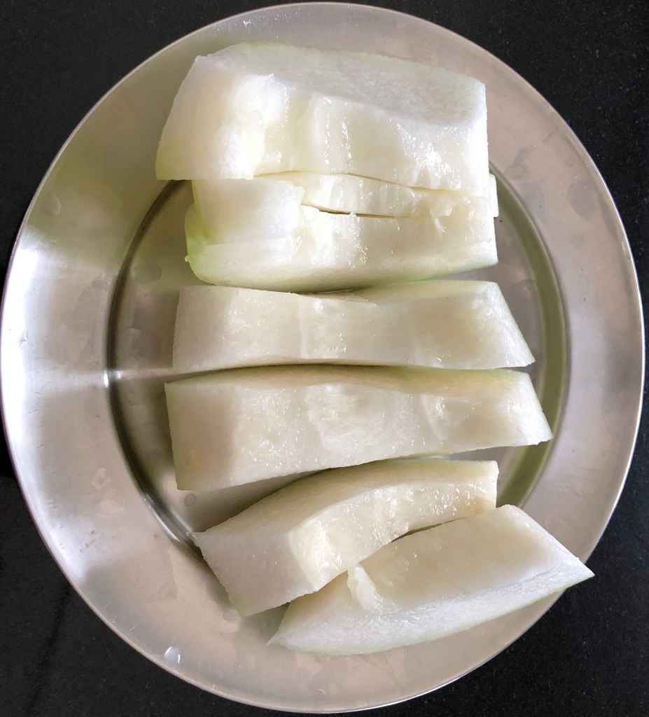 Take ripe white pumpkin where skin shows whitish powder on surface and on chopping the seeds are fully mature. Remove the seeds and skin of the pumpkin.