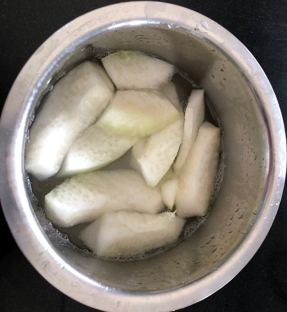 Remove the pumpkin wash it well and cut it into 1 inch cubes. Take about a liter of water and cook the pumpkin in it for about 15 mins till it looks a bit translucent. Remove the pieces from the water.