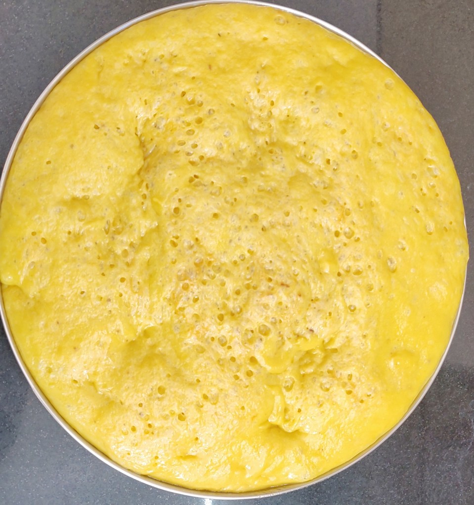 Keep stirring and when the mixture begins to leave the sides, pour it into the ghee coated steel plate.