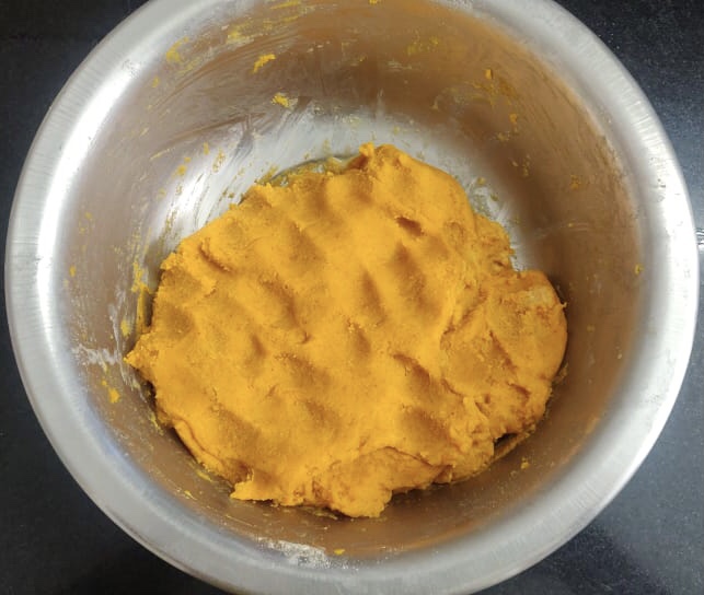 Keep ready a plate with tissue paper on it and a container for keeping the fried ribbons. - Take a big bowl and put all the above ingredients ( except hot oil) and mix them well. Then add hot oil and carefully mix them. Now add water slowly and make a dough – neither too tight nor too sticky. It should be soft.