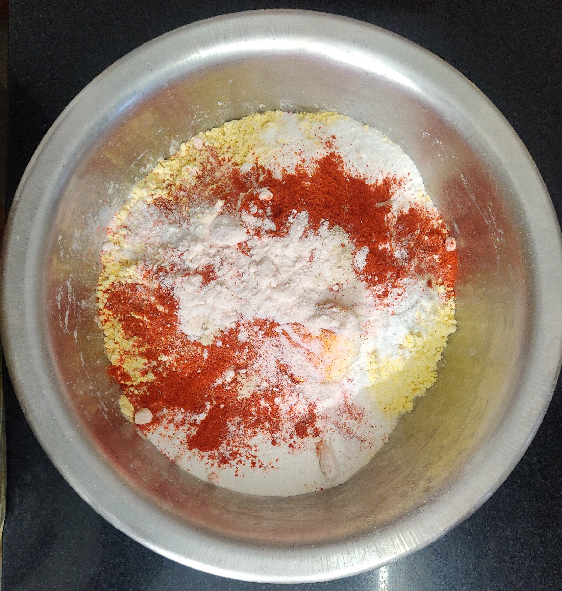 - Before beginning the preparations, please keep oil in a kadai on stove. The oil will be hot by the time we mix the dry ingredients. Addition of hot oil makes the snack crispy.
