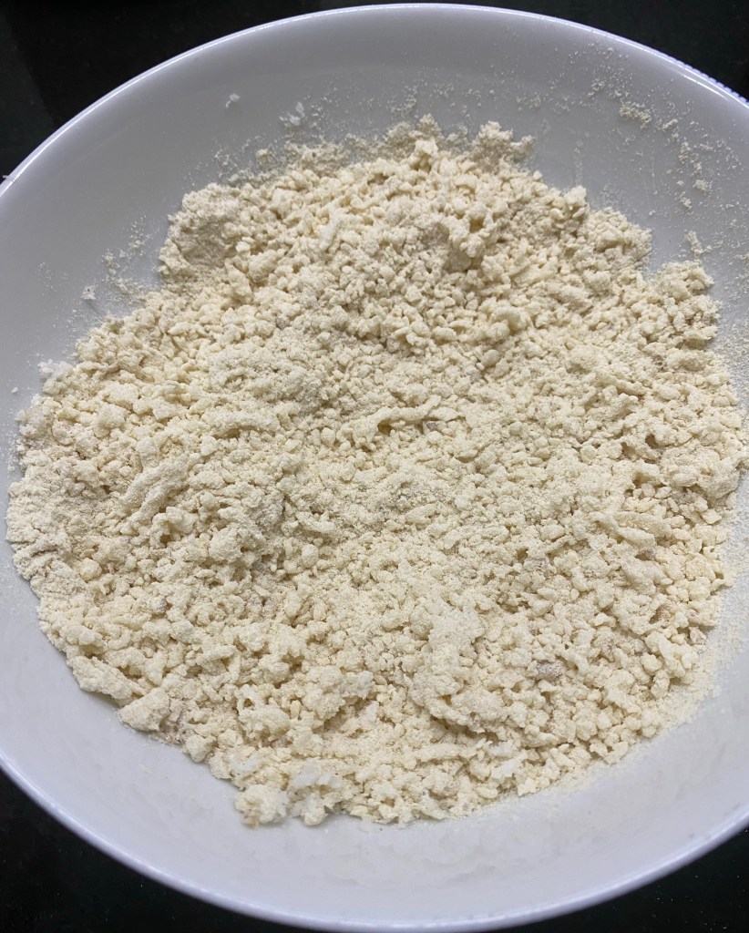 Take Wheat flour in a bowl. Add grated coconut, salt, sugar and baking soda. Mix well.