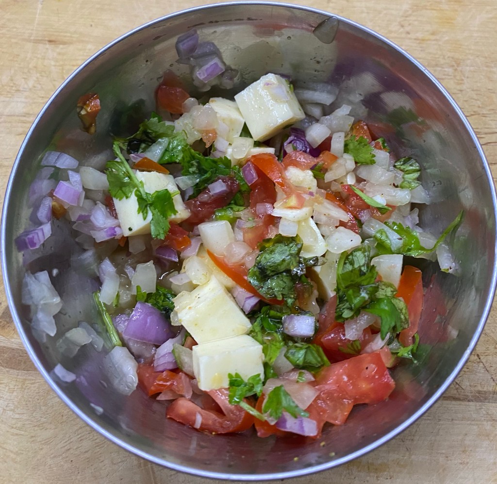1 onion, 1 tomato, 1 cucumber, 1 green chilli, 50 grams paneer, some finely chopped coriander leaves for garnishing and 1/2 teaspoon red chilli powder and salt for taste