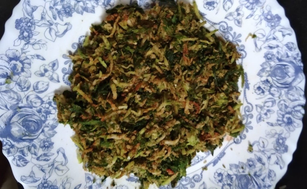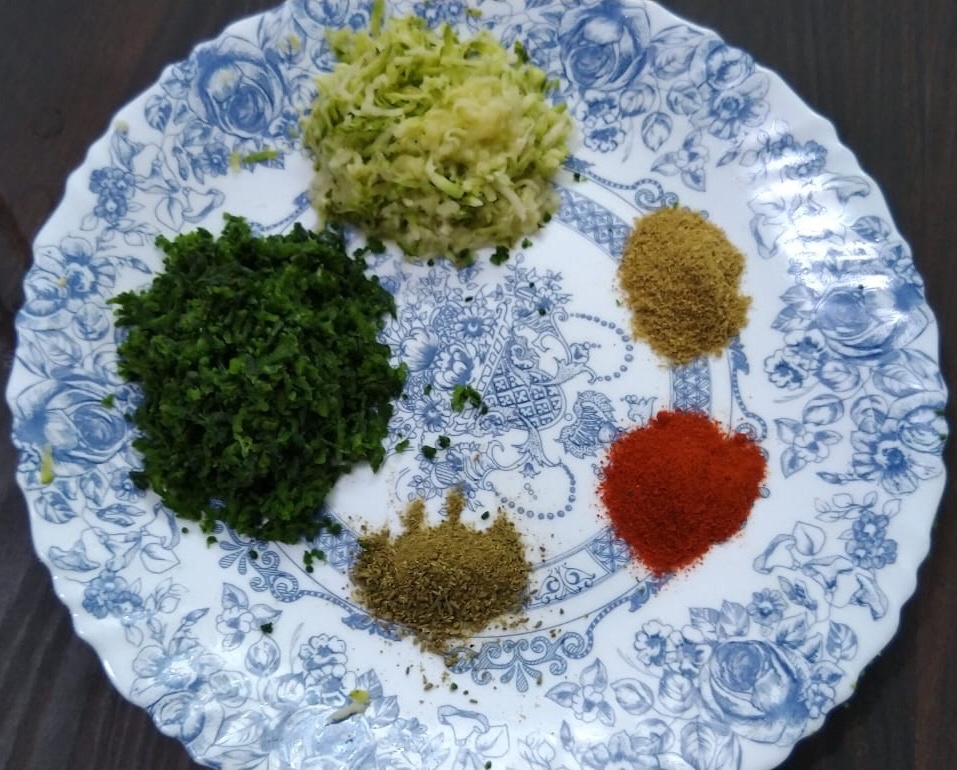 Scrape the karela and remove the rough portions, but don’t discard them.Slit the Karelia in the middle and remove all the seeds.Apply salt on both inside and outside of the karela and the scraps and let it rest for about an hour. After an hour gently squeeze them all and remove the water completely.