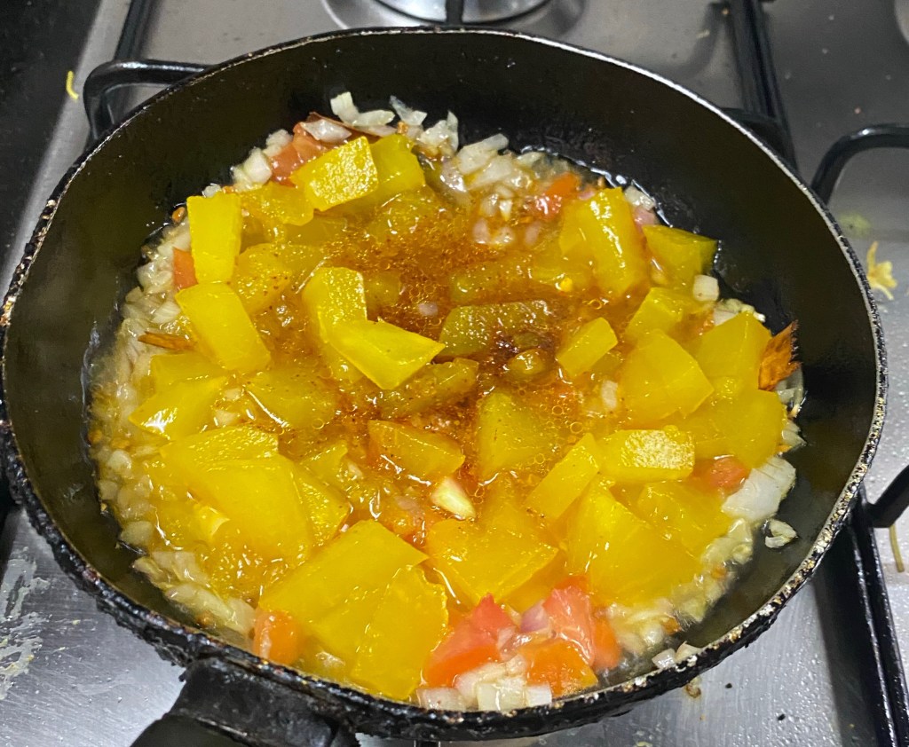 Chop the kikiri into 2 pieces. Peel the skin and remove the seeds. Cut into medium sized pieces. Wash and add salt and turmeric powder and pressure cook for two whistles.