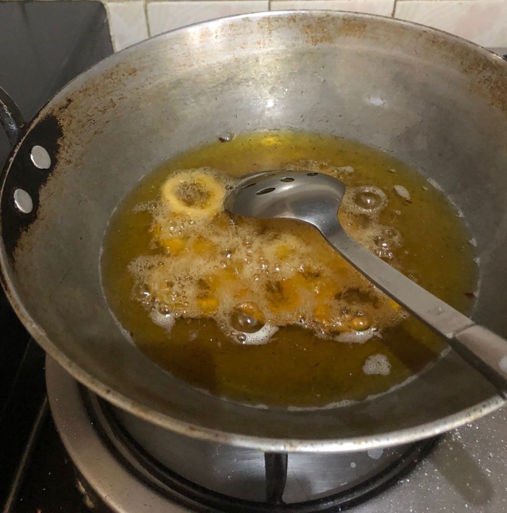 Keep turning & cook till they are golden brown & the bubbles in the oil have stopped .