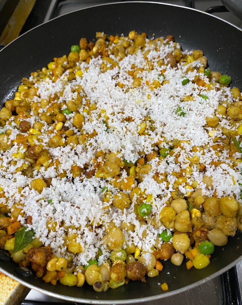 Add the ground Sundal powder and final fresh grated coconut and mix well.