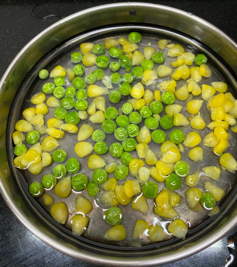 No need to cook the green peas and corn if it is frozen. Just soak in water for 10 minutes.