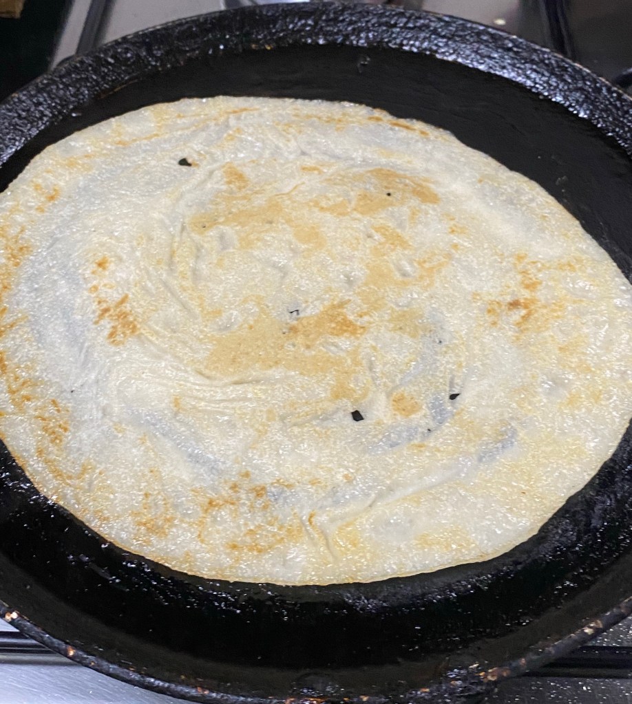 Once it begins to leave the tava from the sides flip it and cook for a few seconds on the other side. Your dosa is ready to be eaten with tomato garlic chutney as accompaniment.