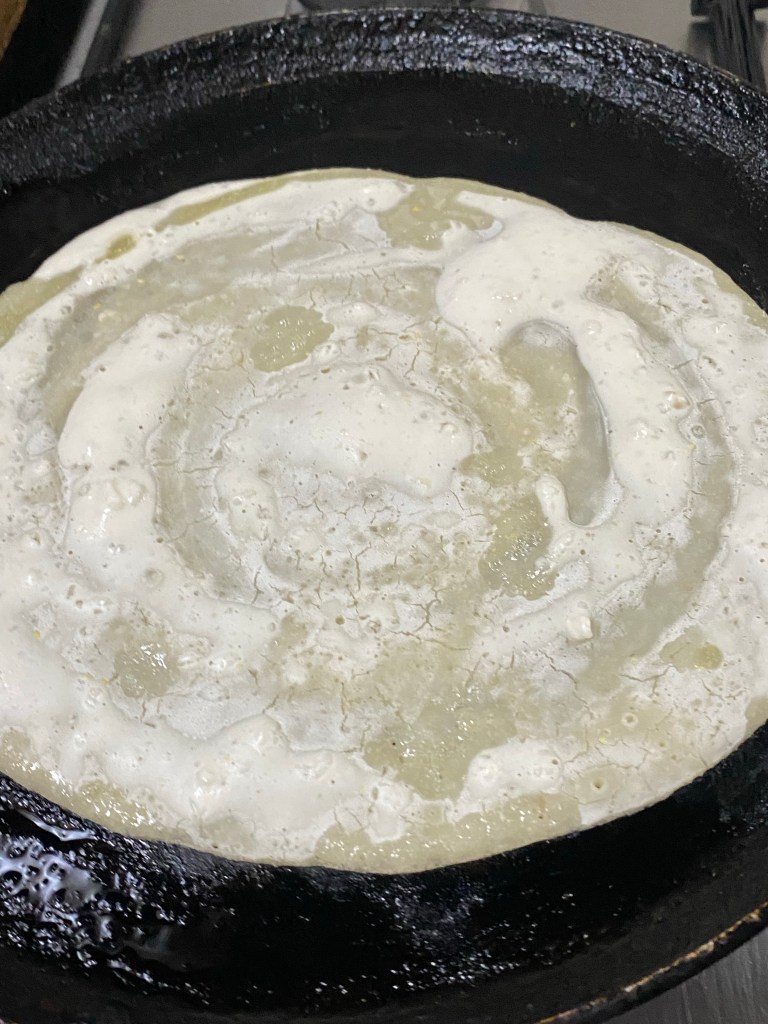 Then take a Dosa tawa and pour the batter on the flat pan with a ladle and gently but quickly spread it out . Now add a teaspoon of oil along the edges .