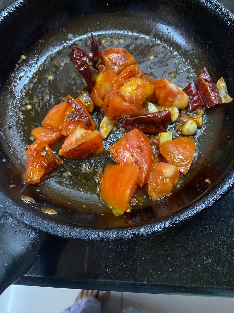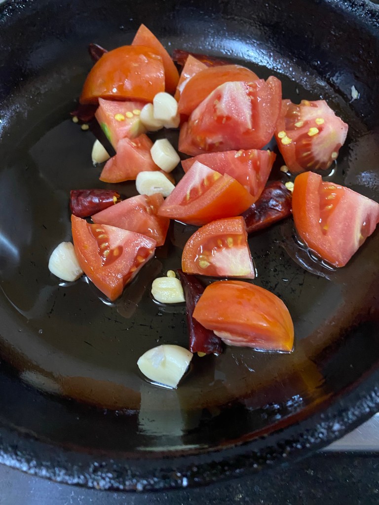 Take oil in a pan. Add garlic cut into pieces , red chillies. Fry , then add chopped tomatoes.