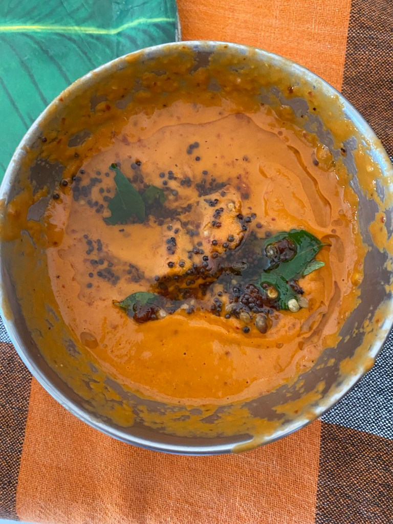For the tempering, heat a teaspoon of oil and add mustard seeds . When it splutters add the urad dal and curry leaves. Pour the tempering over the ground Chutney and mix .