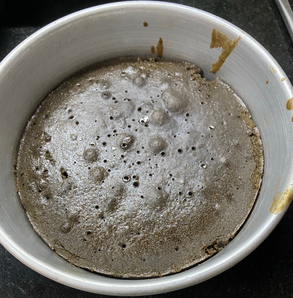 In between check if cooked. Take a greased knife or butter knife and prick inside the cake. If it comes out smoothly it’s cooked.