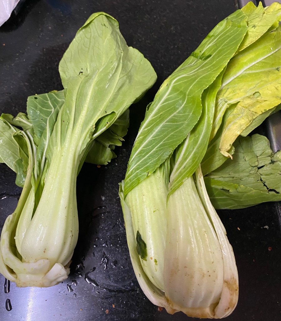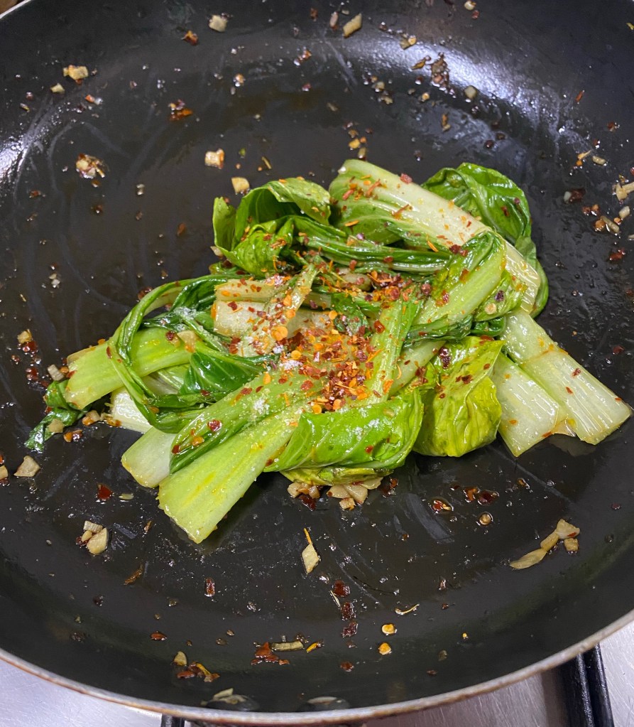 Once butter is foaming, add the pak choi, flat side down in the pan. After about 4 mins, once you have some good colour, turn