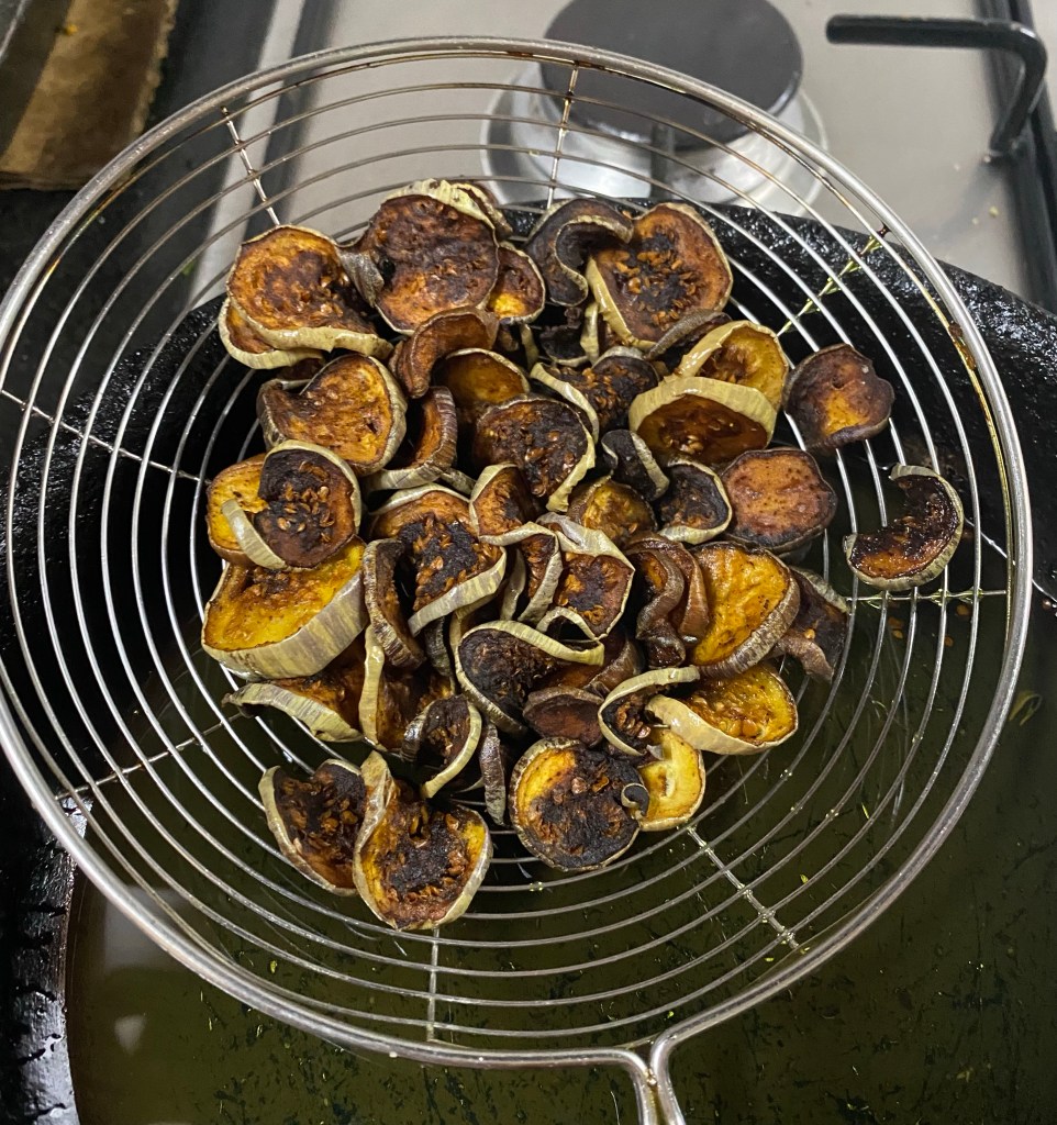 Wash and cut the brinjal into thin or round slices.