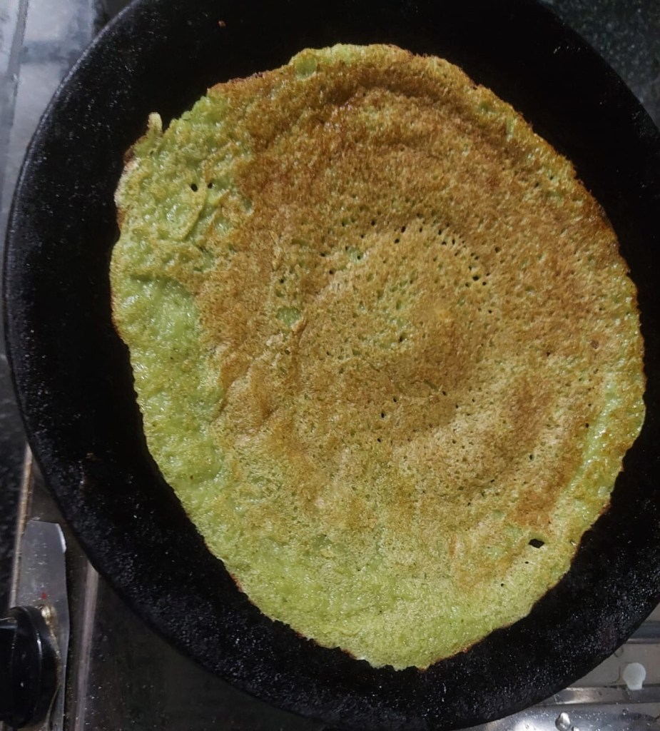 Now heat a dosa tava and spread out a ladleful of the batter evenly . Drizzle a little oil. When dosa starts leaving the sides of the pan flip it over with a spatula and let it cook for a minute on the other side.Your dosa is now ready to serve.