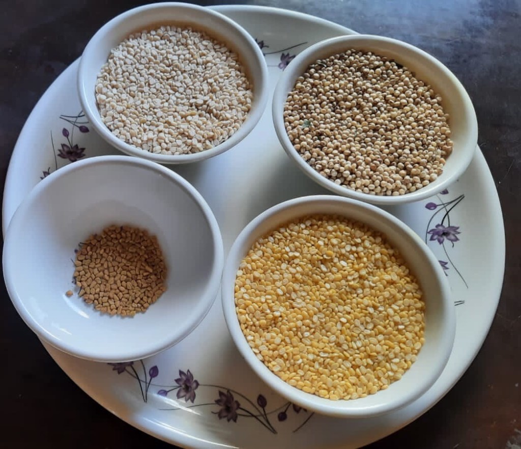 Take the one cup jowar grains, one cup moong dal and one cup urad dal in a container, wash it two to three times , add one tsp of methi . Keep it soaked in water for 8 to 10 hours.
