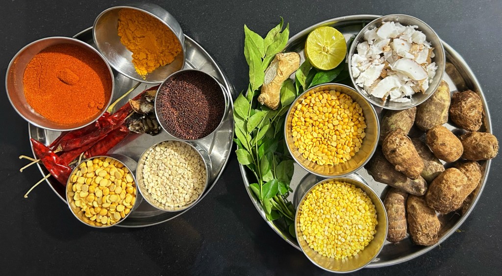 For tempering: Mustard seeds, cumin seeds, curry leaves, coconut oil.