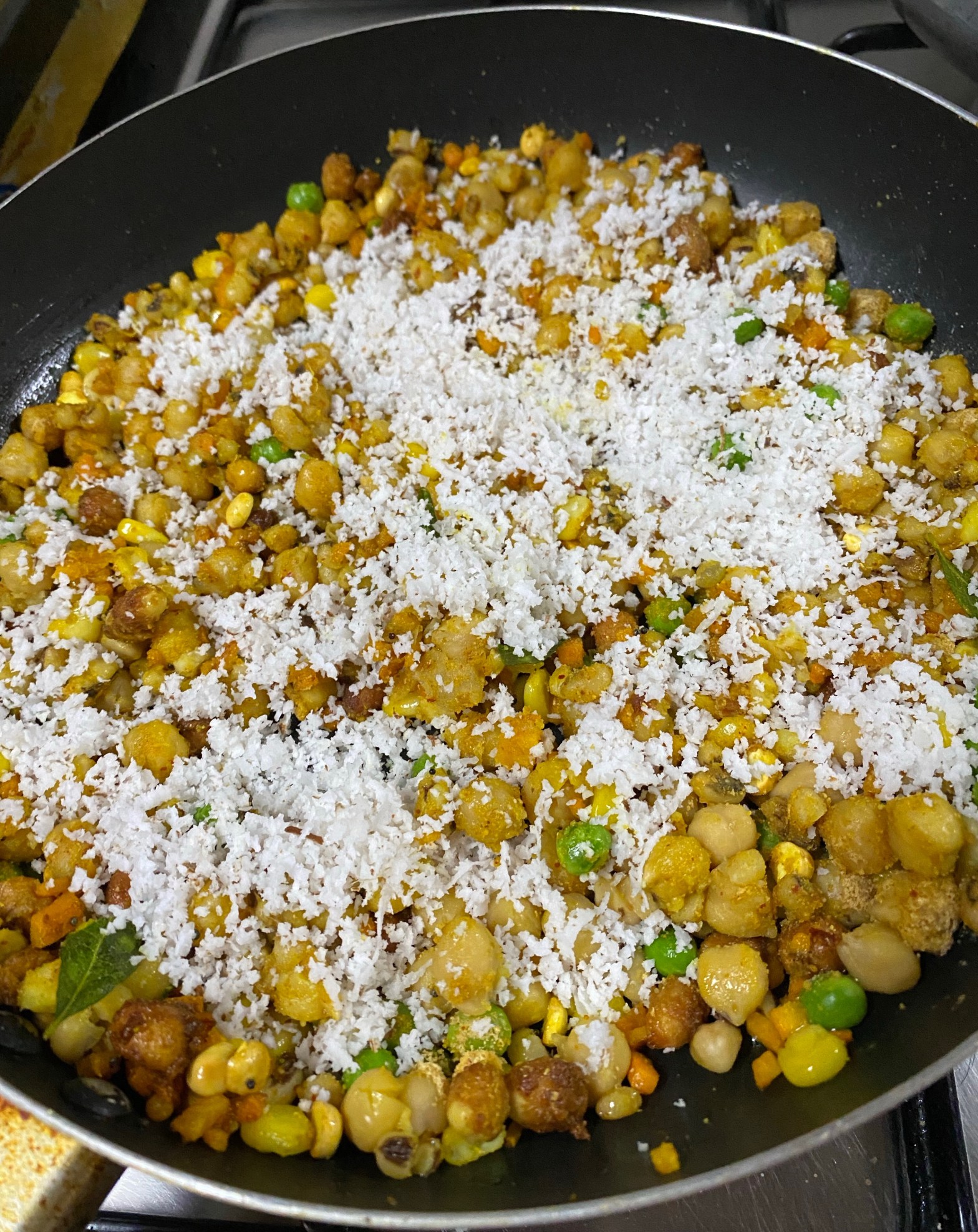 Ingredients: 1 cup White Chana ( soaked overnight), 1/2 cup peanuts (soaked for an hour), 1/2 cup black eyed Cow peas ( lobhia) , 1/2 cup Fresh / frozen Sweet Corn 1/2 cup Green peas 1/2 cup Grated Coconut 1 Carrot finely chopped Turmeric powder-1/4 tsp salt to taste. For tempering – 1 tbsp oil,Continue reading “Sundal (Healthy mixed lentil snack )”